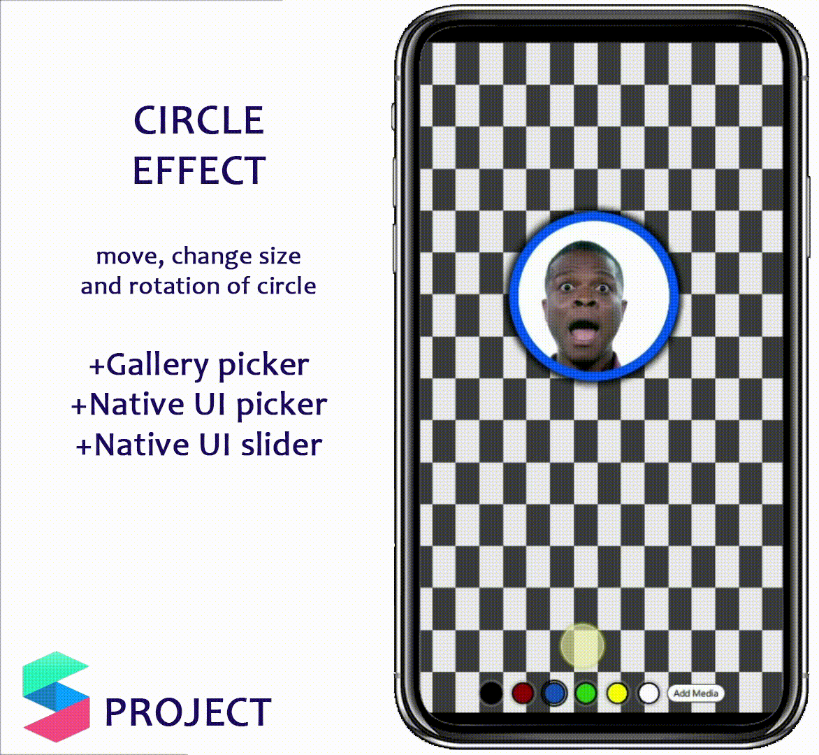 3 PICKER + SLIDER: Перемещение круга, изменение его размера и поворот + возможность добавления файла из галереи телефона (сохраняется соотношение сторон у загруженной текстуры -- вы можете настроить в проекте тип наложения текстуры: заполнение, полный размер и тайл, по тапу переключение цвета фона) + переключение цвета рамки с помощью пикера (переключение происходит плавно, с помощью анимации) + слайдер для изменения размера рамки (v102)
